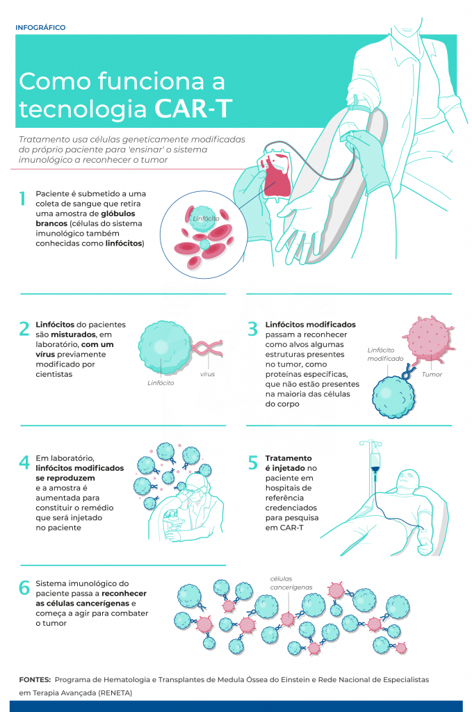 Já o trabalho coordenado pelo Butantan é realizado em parceria com a Faculdade de Medicina da Universidade de São Paulo (FMUSP), a Faculdade de Medicina de Ribeirão Preto (FMRP-USP) e o Hemocentro de Ribeirão Preto desde julho do ano passado. A iniciativa, batizada de Programa de Terapia Celular, ainda aguarda aprovação da Anvisa, mas prevê a participação de cerca de 80 voluntários com diagnóstico de linfoma difuso de células B refratárias.